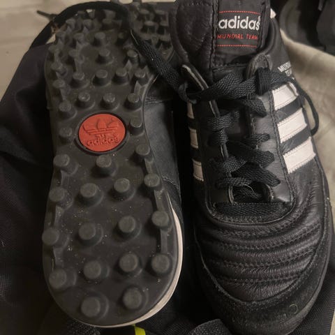 Adidas Copa Mundial fotballsko i sort og hvit farge. Skoene har knotter under for bruk på gressbaner. Skinn som gir god passform og komfort. Mangler lisse på ene skoen, men det kan ordnes. Strl 40