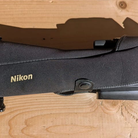 Nikon spektiv med medfølgende stativ og bæreveske. Utstyrt for observasjon og utendørs bruk, egnet for fugletitting og andre naturaktiviteter.