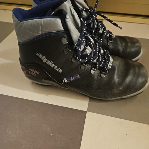 Alpina skisko, størrelse 36, med glidelås foran og forsterket beskyttelse på tå og hæl. Skoene er i svart og sølvfarget materiale. Egnet for langrenn eller lignende aktiviteter.