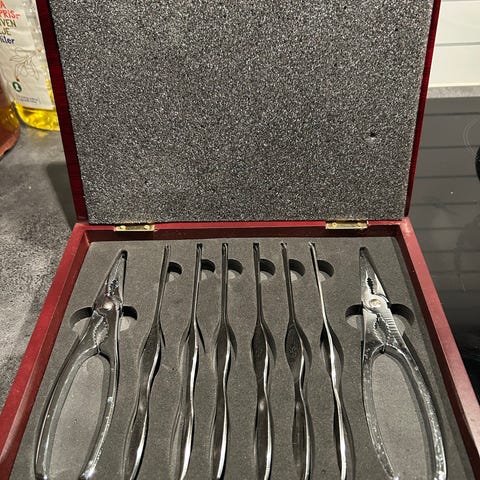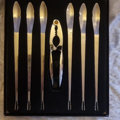 Skalldyrbestikk laget i rustfritt stål. Settet består av flere redskaper med lang, slank design.