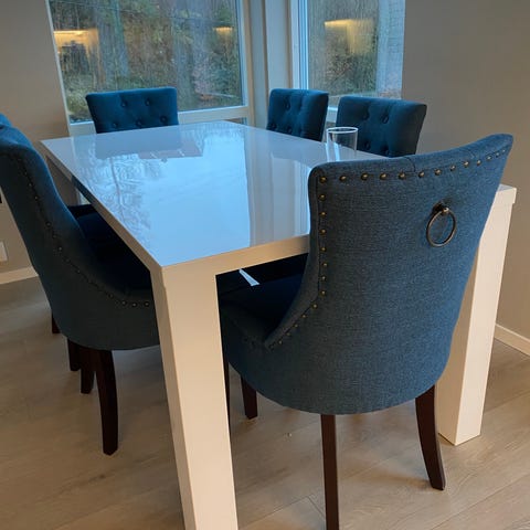 Stolene og bena til bordet er malt hvit.