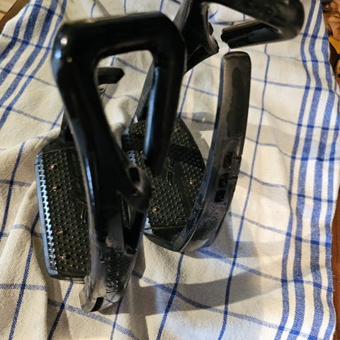 Mangler sikkerhetsstrikkene, kan kjøpes separat. Fungerer med andre ridestøvler enn mountain horse, men går fint nedi sporene med MH ridestøvler.
