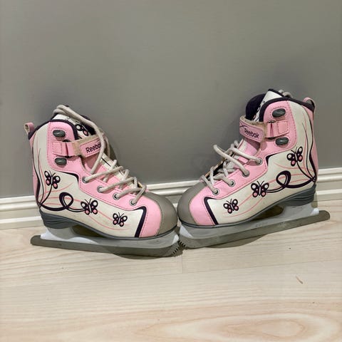 Reebok Andre skøyter i barnestørrelse 34. Skøytene har hvit og rosa farge og er designet for barn. Egnet til skøyting på is.