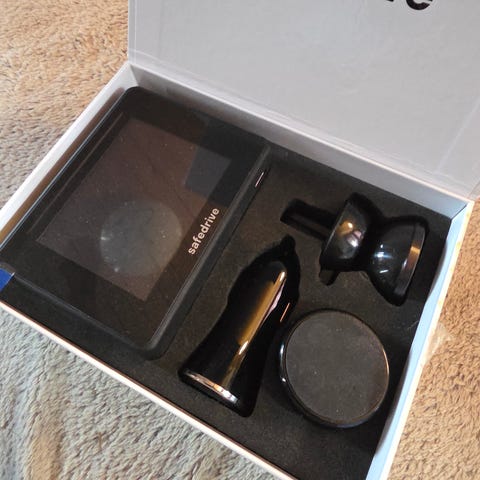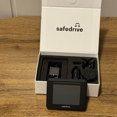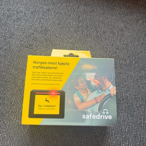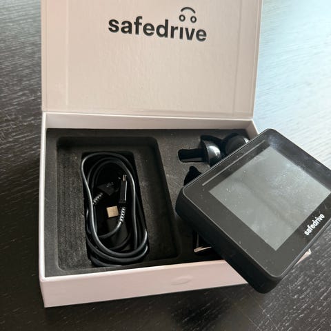 Safedrive Pro GPS-enhet for bil. Enheten inkluderer skjerm, monteringsutstyr og lader. Brukermanual følger med for aktivering og bruk. Produktet er beregnet for varsling ved nærkontakt eller hindring under kjøring, og gir informasjon om kontrollpunkter og potensielle farer i veibanen.