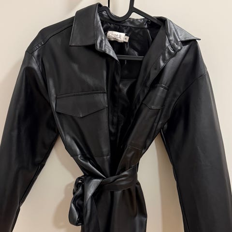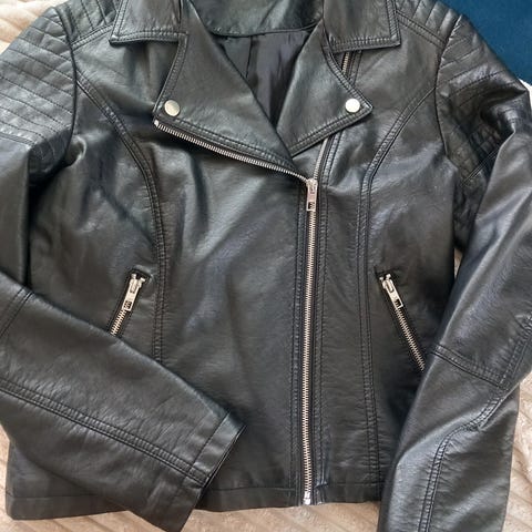 H&M Andre jakker i svart farge, størrelse XS for kvinner. Jakken har glidelåsdetaljer og er laget i et materiale som etterligner skinn.