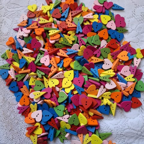 1000 treknapper i hjerteform - avlange som måler ca 22x11mm og de andre måler ca 19mm.