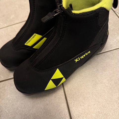 Fischer med svart og gul farge. Støvlene har detaljer i gult og er laget for vintersport.