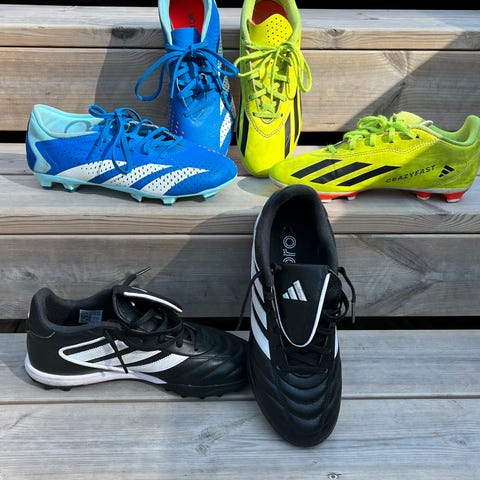 Select leggskinn i grønn og svart farge med justerbare stropper for beskyttelse under fotballspill. Adidas fotballsko i svart med rosa innside, størrelse 35 designet for bruk på kunstgress med knotter på yttersålen for grep.