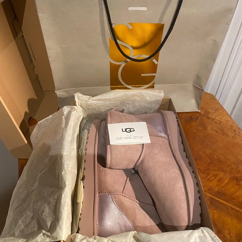 NYE UGG støvler størrelse 40/USA 9/UK 7,5/, beige farge (W Gita 1018517 W /CHE). Laget av semsket skinn med gummisåle. Designet for å gi varme og komfort. Støvlene har mykt og varmt fôr, egnet for kalde værforhold. Laget av semsket skinn med en robust såle for godt grep. Støvlene er kjøpt hos Shoe Gallery på Lamberseter senter.