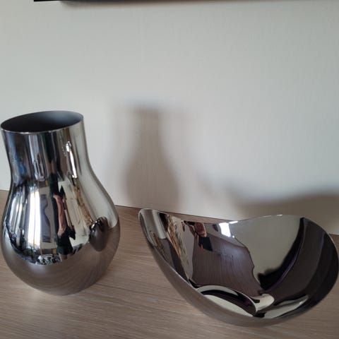 Georg Jensen dekorasjonssett bestående av flere deler i rustfritt stål. Settet inkluderer to lysestaker, en skål med bølget form, og to mindre lysestaker eller skåler med avrundede kanter.