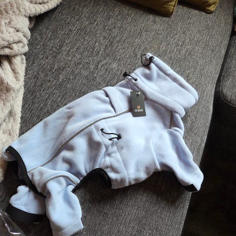 Dress til hund, litt allværsmodell, og luner også godt om vinteren med fleece inni. Borrelåsen på det ene bakbeinet samt oppe ved halsen har løsnet litt og kan sikkert ordnes hvis man vil.