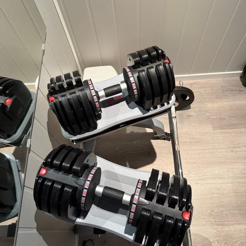 Justerbar treningsbenk i svart farge med polstret sete og ryggstøtte. Benken har hjul for enkel flytting og er egnet for ulike styrketreningsøvelser.