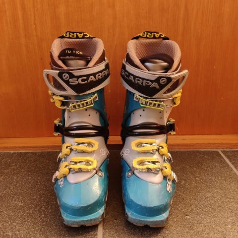 Støvlene er godt brukte. De er tapet et par plasser for å unngå gnissing. Og gå/kjøremodus bryter på baksiden. Støvlene har justerbar forward lean. Sålene er fine og hælfestet og. Passer bindinger type Dynafit med pin.
