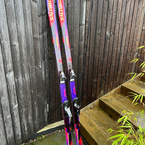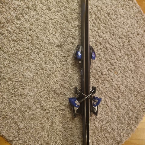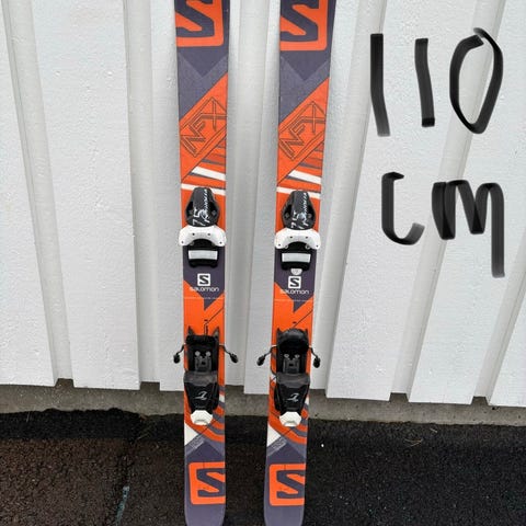Salomon Marti F110 alpinski (twintip) med bindinger. Medfølgende staver fra Scott med justerbare stropper, 85 cm.