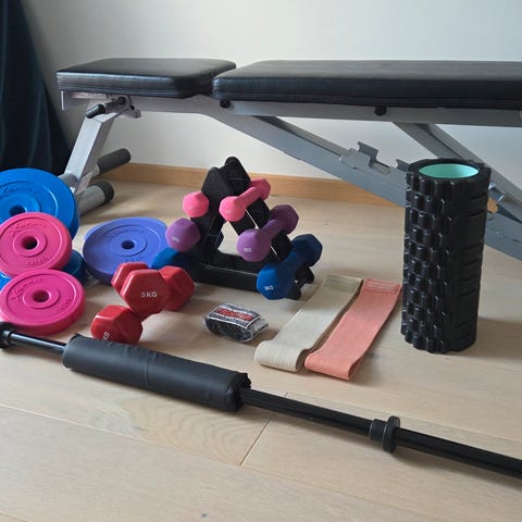 Selger benk og manualsett med 10, 12,5 og 15 kilo.