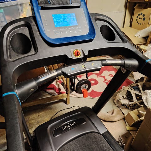 Titan Life Treadmill treningsapparat med digital skjerm. Utstyrt med flere funksjoner for trening, inkludert tidsmåler og ulike treningsprogrammer. Designet for innendørs bruk.