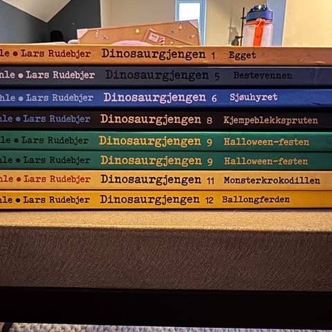 Selger unna et knippe pent brukte barnebøker av Lars Mæhle og Lars Rudebjer.