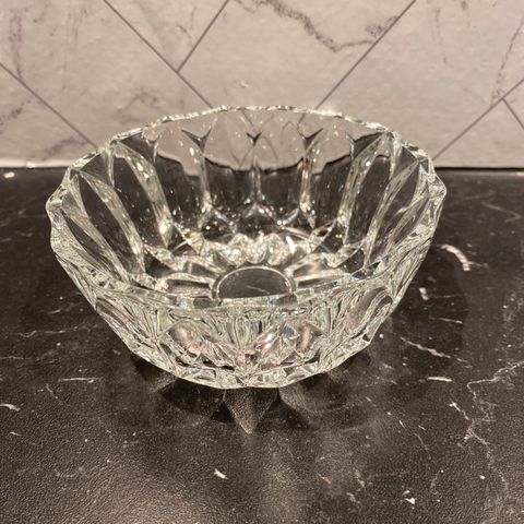 Selger en krystallskål med tilhørende lokk. Den har stått til pynt i glasskap. Er fra slutten av 1970 - tallet