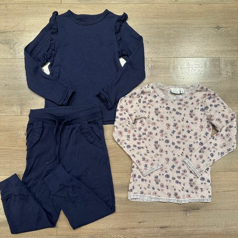 Brukt til barnet ble ca 108 cm høy, buksa hadde nok passet litt lenger å men trøya ble litt for trang (passet fortsatt i lengde)