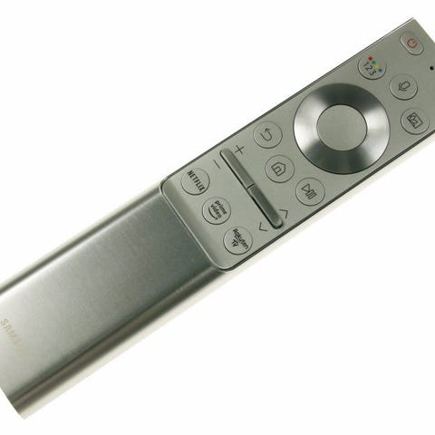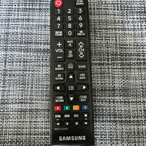 Samsung fjernkontroll for TV med svart og sølvfarget design. Fjernkontrollen har touchpad-funksjon og knapper for volumkontroll, kanalvalg og navigering. Passer til Samsung TV-apparater.