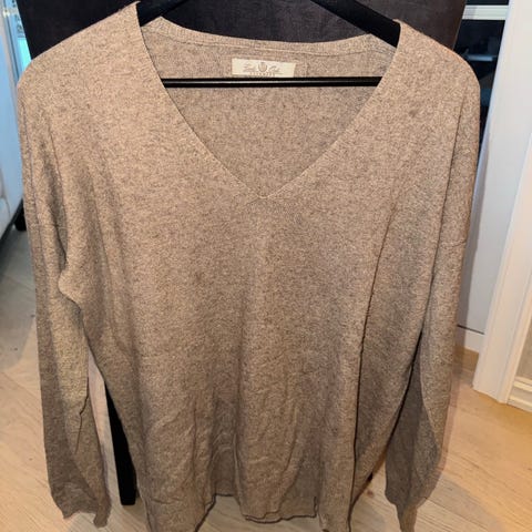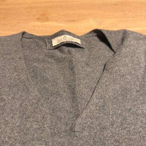 Stilig genser i kashmir, lysegrå og off-white striper. Made in Italy: Veldig lett og nett. Kommer med klespose til kashmir.