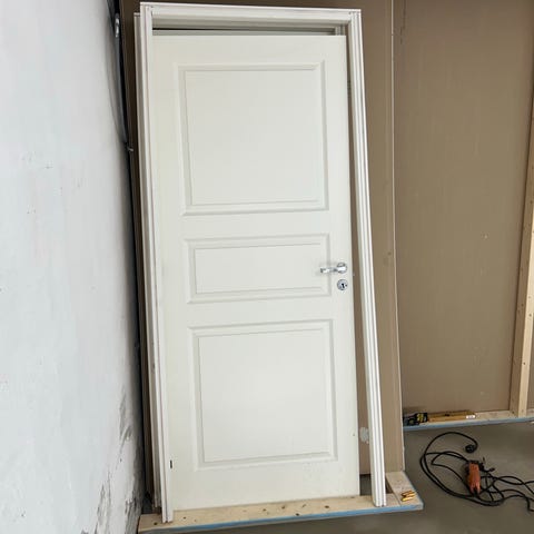 Dør i heltre. Følger med dørkarm og terskel i brukbar stand.