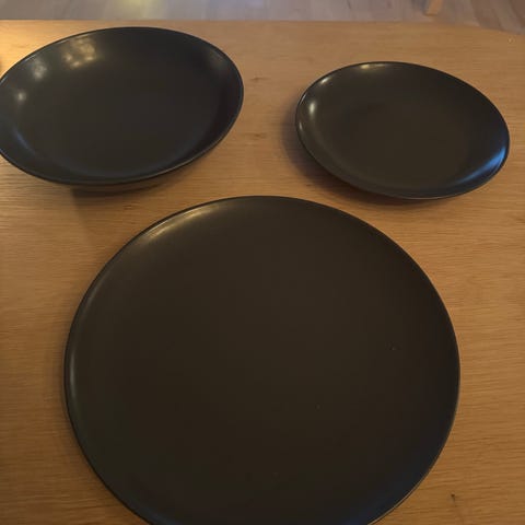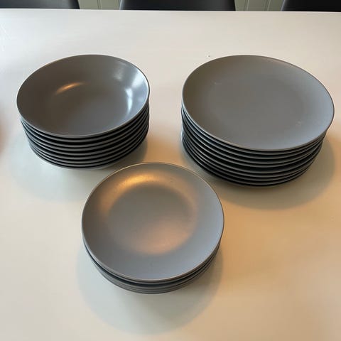 IKEA tallerkensett i matt mørk grå/sort farge. Settet består av 6 store tallerkener, 6 små tallerkener og 6 skåler. Har x2 sett tilgjengelige (totalt 12 stk av hver).