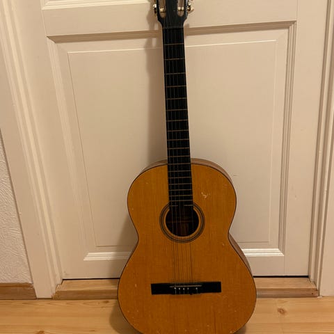 Denne klassiske gitaren (kjøpt på 4-Sound) har en fin klang og er perfekt for nybegynnere. Jeg byttet til nye nylon-strenger i sommer og den har kun noen få synlige bruksmerker på baksiden.