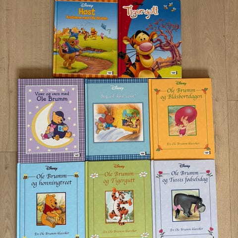 Ole Brumm barnebøker med ulike titler, inkludert 'Bestevenner'. Passer for barn som leser eller blir lest for.
