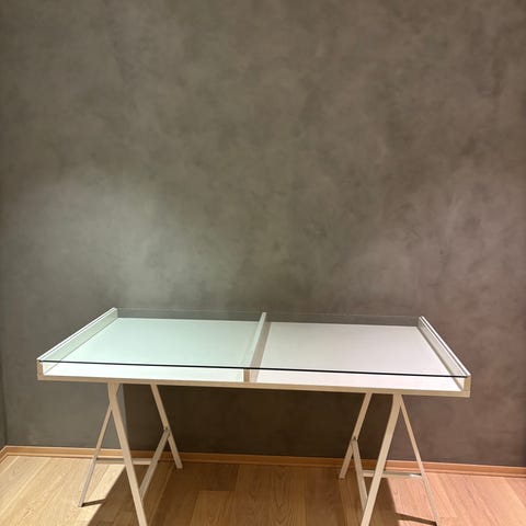 Skrivebord i børstet stål og med topplate i frostet glass. Pent brukt. Ser ingen merker. Må hentes på Røa i Oslo.