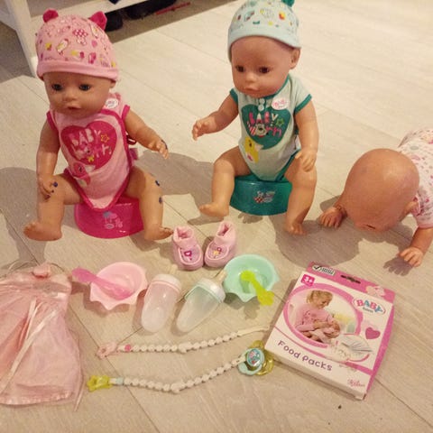 Et rosa barnekjøkken med tallerkener og annet kjøkkenutstyr. Glasset er av plast og holdes sammen med gjennomsiktig tape i bunndøren
