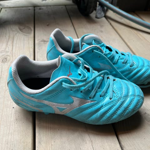 Mizuno Monarcida fotballsko i blå farge, størrelse 41. Skoene har knotter for bruk på gress/kunstgress.