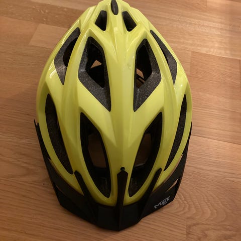 Met sykkelhjelm i størrelse M, blå farge. Hjelmen har ventilasjonshull og justerbare stropper for tilpasning. Egnet for sykling og gir beskyttelse til hodet.