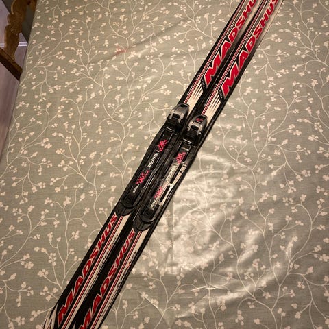 Ski med lengde 120 cm. Skistaver med lengde på 95 cm i blå farge.