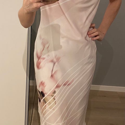 Nydelig riccovero kjole i str 38. Glidelås i ryggen og underkjole. Den mangler en knapp bak (se siste bilde) og selges derfor rimelig.