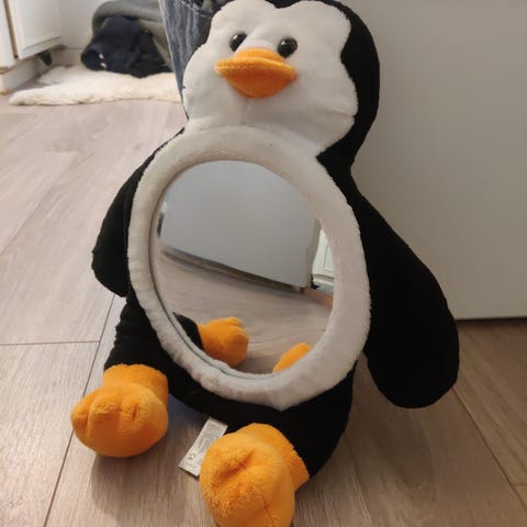 Søtt LUCA bilstolspeil, pingvin. Speilet er konvekst, dette gir et bredt synsfelt slik at du lettere kan følge med på hva som skjer i baksetet. Speilet monteres enkelt på nakkestøtten og kan justeres i vinkel etter behov. Kjekt for barnet at speilet har mykt kosedyrdesign.