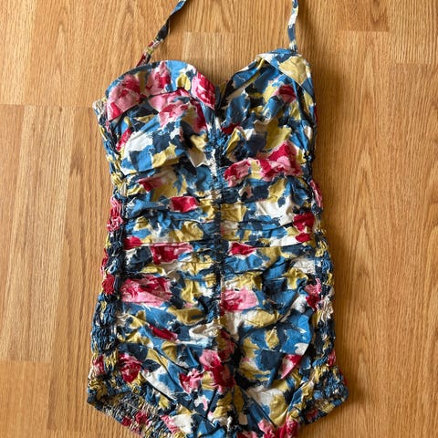 Marineblå stretch badedrakt. Ikke morken. Knapp på den ene skulderen. Dobbelt stoff i skrittet, ellers ikke noe for. Dette var de første moderne badedraktene i kunststoff.