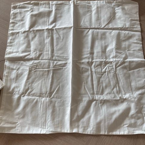 Hvitt bomulls hodeputetrekk med broderier i hvert hjørne øverst. 5 cm bred kappe rundt. Åpning nederst med klaff innvendig som homder puten på plass. Og for hodepute ca 48 cm bredde og høyde ca 43 cm. Tatt bilder av broderiet på vrangen som viser håndbroderi. Bomullsstoffet er mykt og tettvevd. Ser ingen slitasje.. Fastpris.