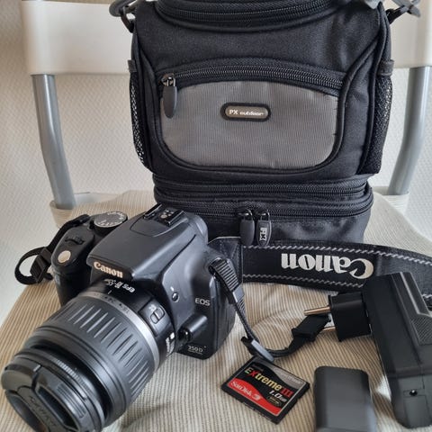 To speilreflekskamera / systemkamera (Canon EOS 350D) med divers tilbehør.