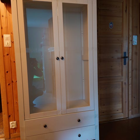 Skapet har 9 glasshyller, glassdør med ramme av bjørk og innlagt lys. Skapet er like fint. Det kan brukes til oppbevaring av alt fra glass, kopper, pynteting, figurer/leker.