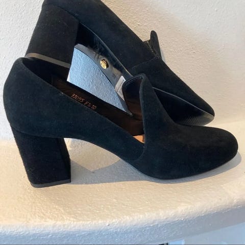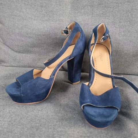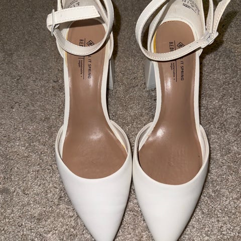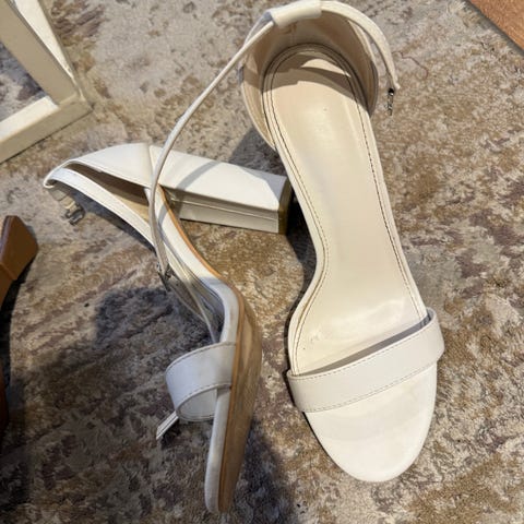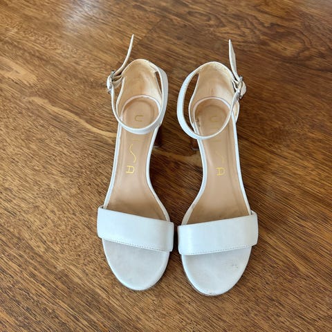 ECCO hæler i størrelse 40, hvit farge. Skoene har åpen tå og ankelstropp med spenne. Materiale er ikke spesifisert. Designet for kvinner.