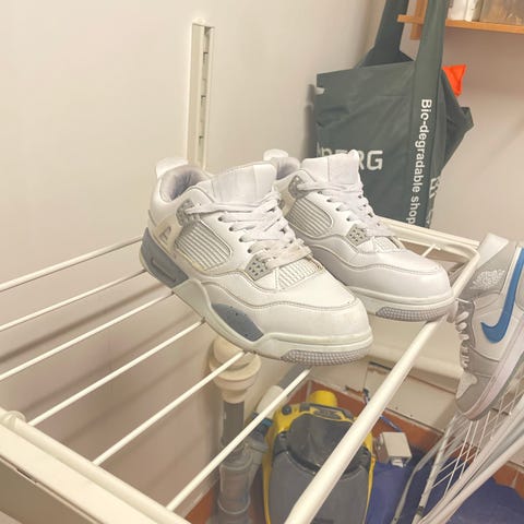 Nike Air Jordan 4 sneakers i hvit og grønn farge. Skoene har en klassisk basketballsko-design med synlige detaljer som inkluderer den ikoniske Jumpman-logoen. Yttersålen har mønster for godt grep. Skoene er laget for menn og egner seg til både sport og fritidsbruk.