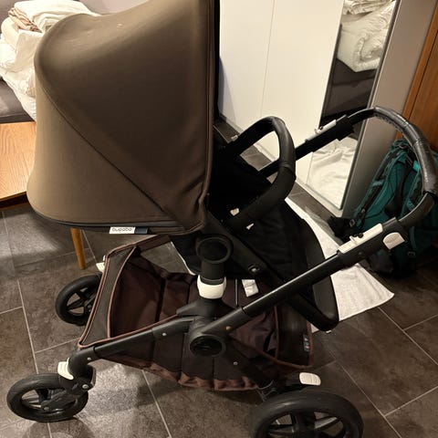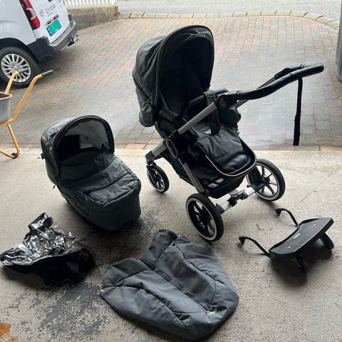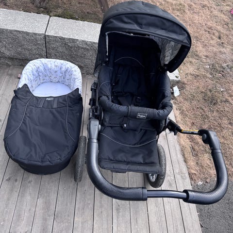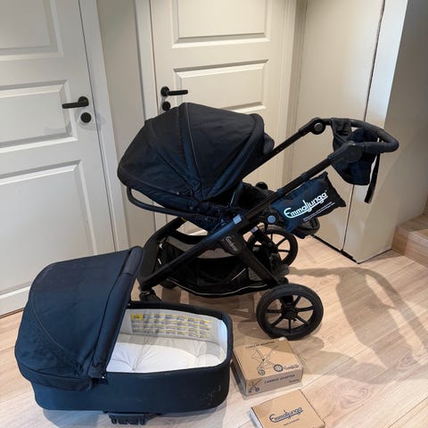 Emmaljunga barnevogn i svart farge. Barnevognen inkluderer sete og tilbehør som er synlig på bildene. Egnet for transport av barn med fokus på funksjonalitet og komfort.