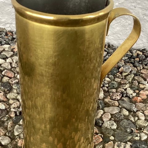 MESSING KRUS, Høyden er 10 cm, kruset er rund, diameter 8 cm, Bredde med hanken er 12,2 cm, veier 155 gram. Messing kruset er Meget fint! Meget spesielt! Se alle bildene for å få et inntrykk av kruset. Er fra 1970-tallet.