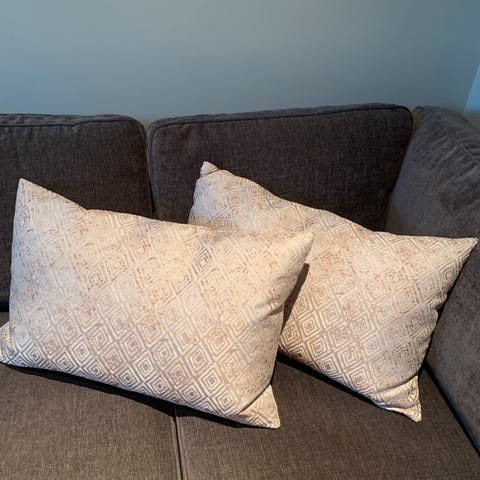 Pene gule pynteputer i velour. Avtagbart trekk som kan vaskes forsiktig.