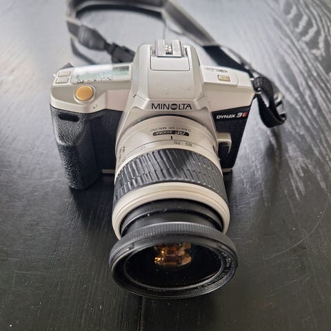 Minolta Dynax 500si speilreflekskamera uten objektiv. Kameraet er svart og har et klassisk design for fotografering med utskiftbare objektiver.