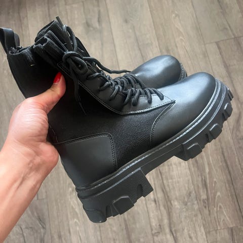 Nelly boots/hæler i størrelse 41, svart farge. Skoene har en høy hæl og er laget med et elastisk materiale som gir en sokkelignende passform.