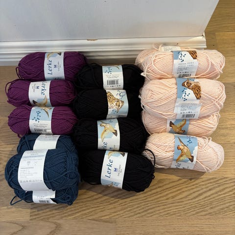 7 nøster mint, 7 nøster marineblå og 3 nøster natur.