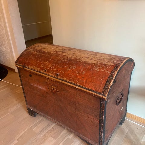 Treskatt kiste med detaljerte utskjæringer og metallås. Laget av tre med naturlig trestruktur innvendig. Egnet for oppbevaring av ulike gjenstander.