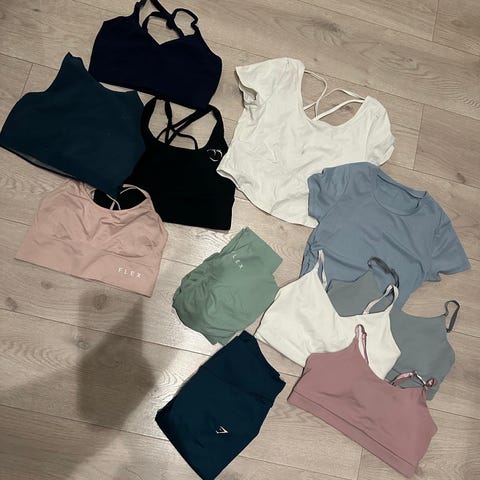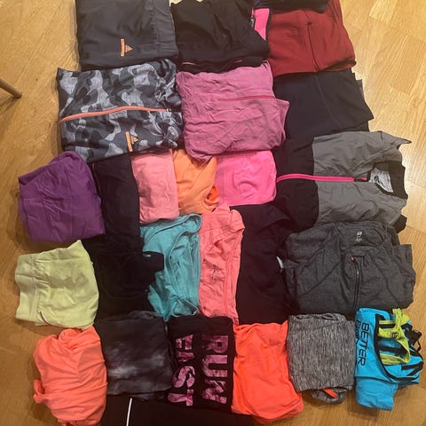 3 treningstightser (2 i str L fra HM og 1 i str XL fra 2XU med refleks på). Den fra 2XU er liten i str så passer godt for str L. To treningsgensere passende str L. Lys gul unisex nike genser i str M og tettsittende treningsgenser fra HM i str XL. Selges samlet som pakke.
